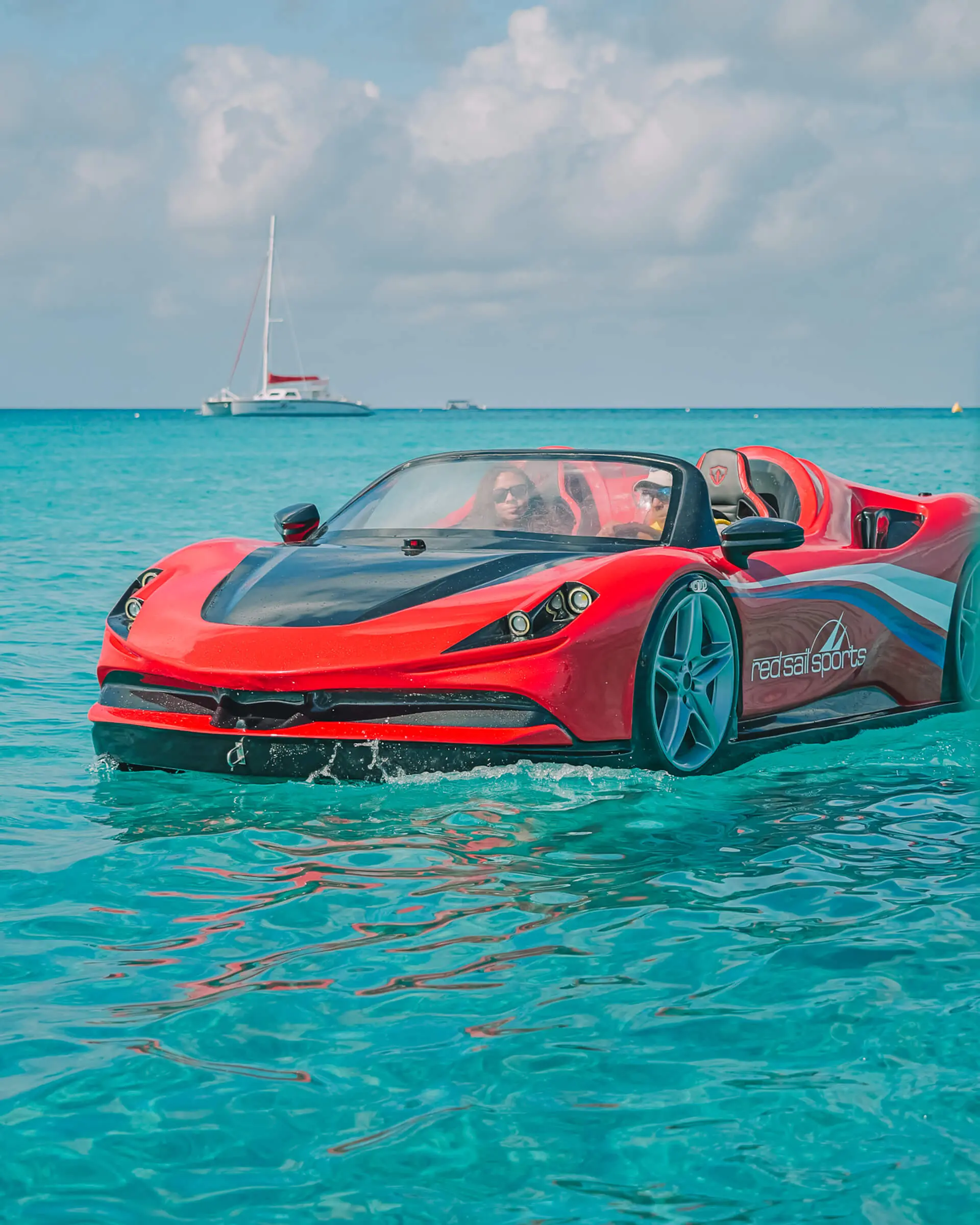 Choose your ride: Red Rush or Red Lightning – both sleek red Ferrari-inspired jet cars built to make waves and steal the spotlight.